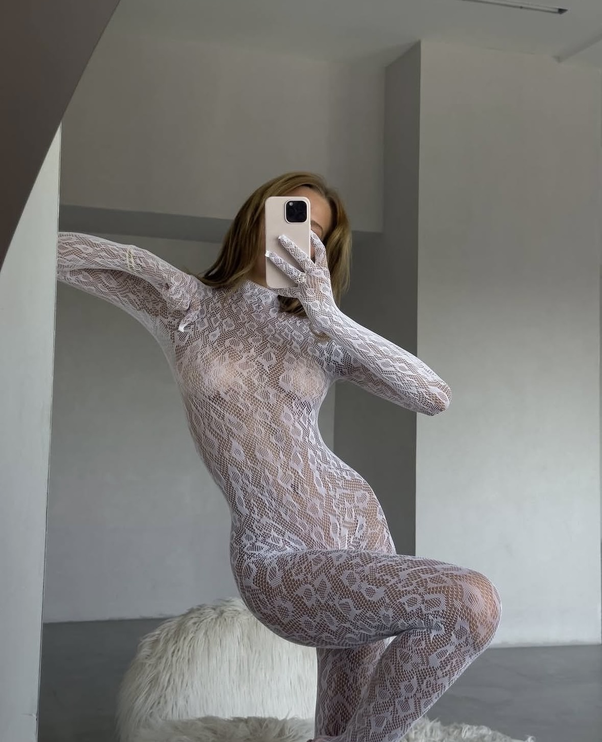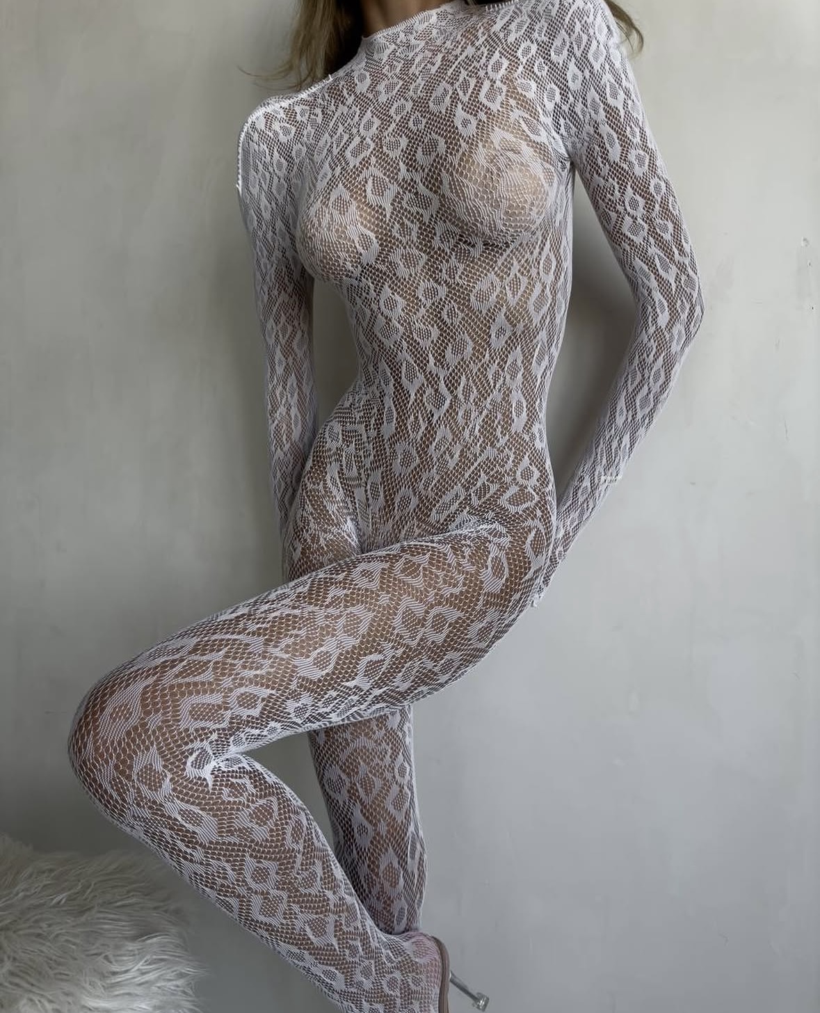 Beli kombinezon koji nežno prati liniju tela, stvoren da ostavi utisak.